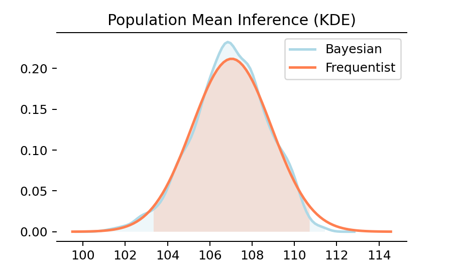 빈도주의 접근과 베이지안 접근에 따른 모평균 추정치를 비교해 보면 결과가 거의 비슷합니다. 이처럼 간단한 추론 작업에서 빈도주의와 베이지안 모형의 차이는 거의 없습니다. 그렇기 때문에, 여러 번 반복 시행의 샘플링 과정을 거쳐야 하는 베이지안 보다는 비교적 간단한 공식으로 결과를 도출할 수 있는 빈도주의 모형이 즐겨 사용됩니다.