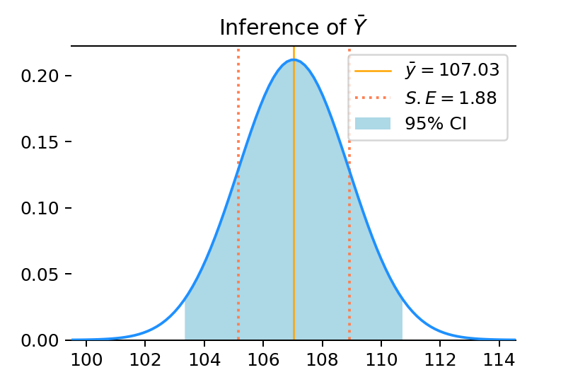 어찌됐든 모평균의 추정치가 존재하는 정규분포를 구했기 때문에, 정규분포의 정의를 이용해 모평균의 추정치가 존재하는 일정한 구간을 "신뢰도"와 함께 표현할 수 있게 됩니다. 예컨대 모평균은 95%의 신뢰도로 \(\bar y - 1.96 S.E\) ~ \(\bar y + 1.96 S.E\) 구간 안에 존재한다고 가정할 수 있습니다. 앞서 본 예시 샘플의 경우, 모평균은 정규분포 \(N(107.17, 1.88^2)\)에서 추론되고, 95%의 신뢰도로 102.64~110.18 사이에 존재한다고 추정할 수 있습니다.