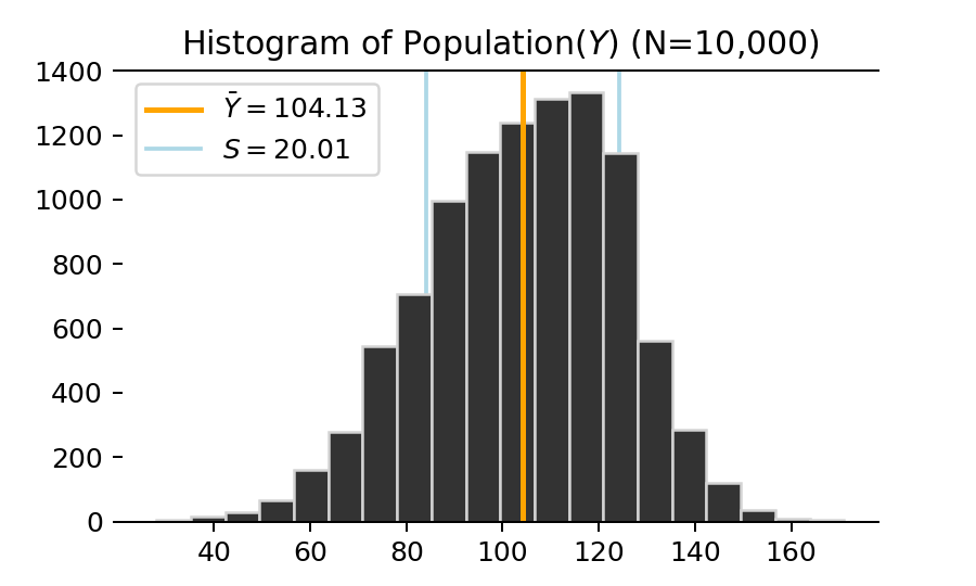 따라서 우리는 모집단의 구조에 대해서는 직접적인 기술을 할 수 없고, 가정에 근거한 추론을 해야 합니다. 위 그림에는 모집단의 평균, 즉 모평균(\(\bar Y\))이 101.37이고 모표준편차(\(S\))는 20.88이라고 표시되어 있지만, 실제 세계에서 모집단을 모르는데 이런 모수들도 당연히 알 수 없습니다. 일정한 가정에 근거해 주어진 표본으로터 추론을 할 수 있을 뿐입니다.
