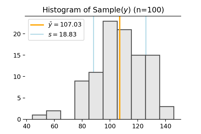 이 샘플의 구조를 기술해 봅시다. 즉 분포의 구조를 나타내는 통계량들을 구해봅시다. 먼저 샘플의 평균, 즉 표본평균(\(\bar y\))은 107.17로 추정됩니다. 표본의 표준편차, 즉 표본표준편차(\(s\))는 18.84로 추정되네요. 분포의 모양새가 비대칭적이긴 하지만, 아무튼 전체적으로 관측치들이 107.17을 중심으로 평균적으로 18.84 정도 떨어져서 분포하고 있다고 표현할 수 있습니다.