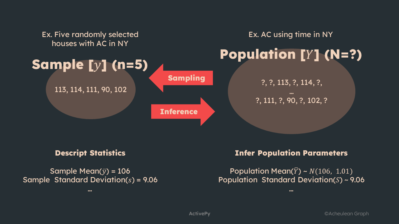 한편 어떤 표본은 그 표본이 수집되어 나온 모집단(population)을 대표하는(represent) 데이터이기도 합니다. 그리고 모집단의 분포의 구조를 표현하는 지표를 모수(parameter)라고 부릅니다. 모평균, 모표준편차 같은 것들이 되겠죠. 그런데 모집단 자체는 우리에게 알려져 있지 않기 때문에, 모집단의 모수는 기술할 수 없고 추론(inference)할 수 있을 뿐입니다. 이때 모집단의 모수를 추론하는 일을 추론 분석이라고 부릅니다.