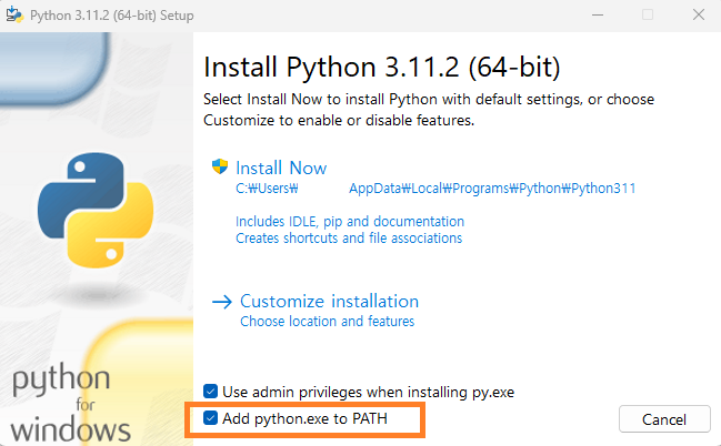 윈도우에서는 설치 시 아래와 같이 "Add python.exe to PATH" 옵션을 활성화해줍니다.
